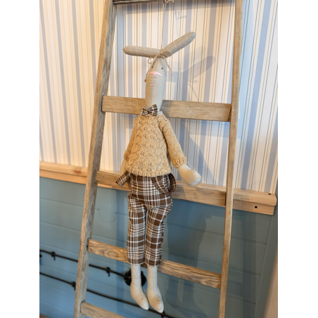 Ręcznie szyty w pracowni rękodzieła zając z naturalnych tkanin z dodatkiem robionych na szydełku sweterku i spodniach w kratę.