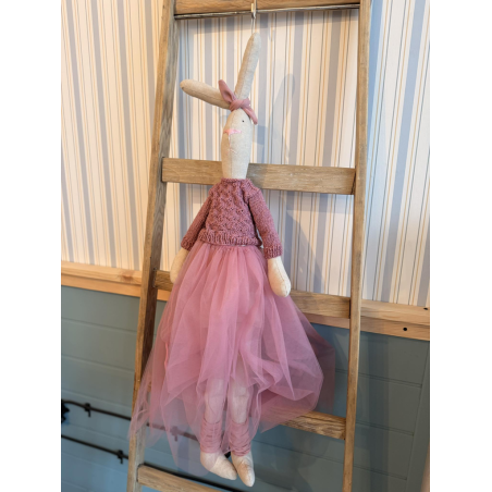 Ręcznie szyty w pracowni rękodzieła zając z naturalnych tkanin z dodatkiem robionych na szydełku sweterku i tiulowej spódnicy.