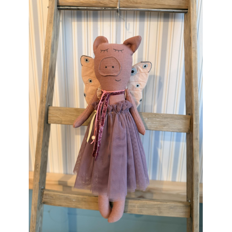 Ubrana w tiulową spódnicę oraz ściągane skrzydełka.